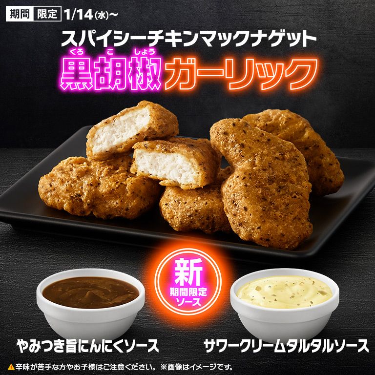 「スパイシーチキンマックナゲット 黒胡椒ガーリック」のほうはスパイシーっぽい感じに見える。