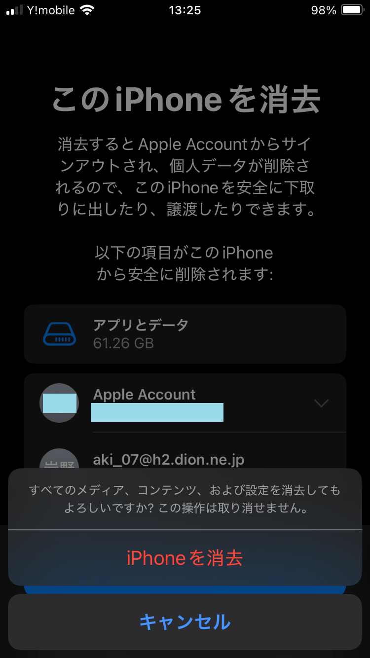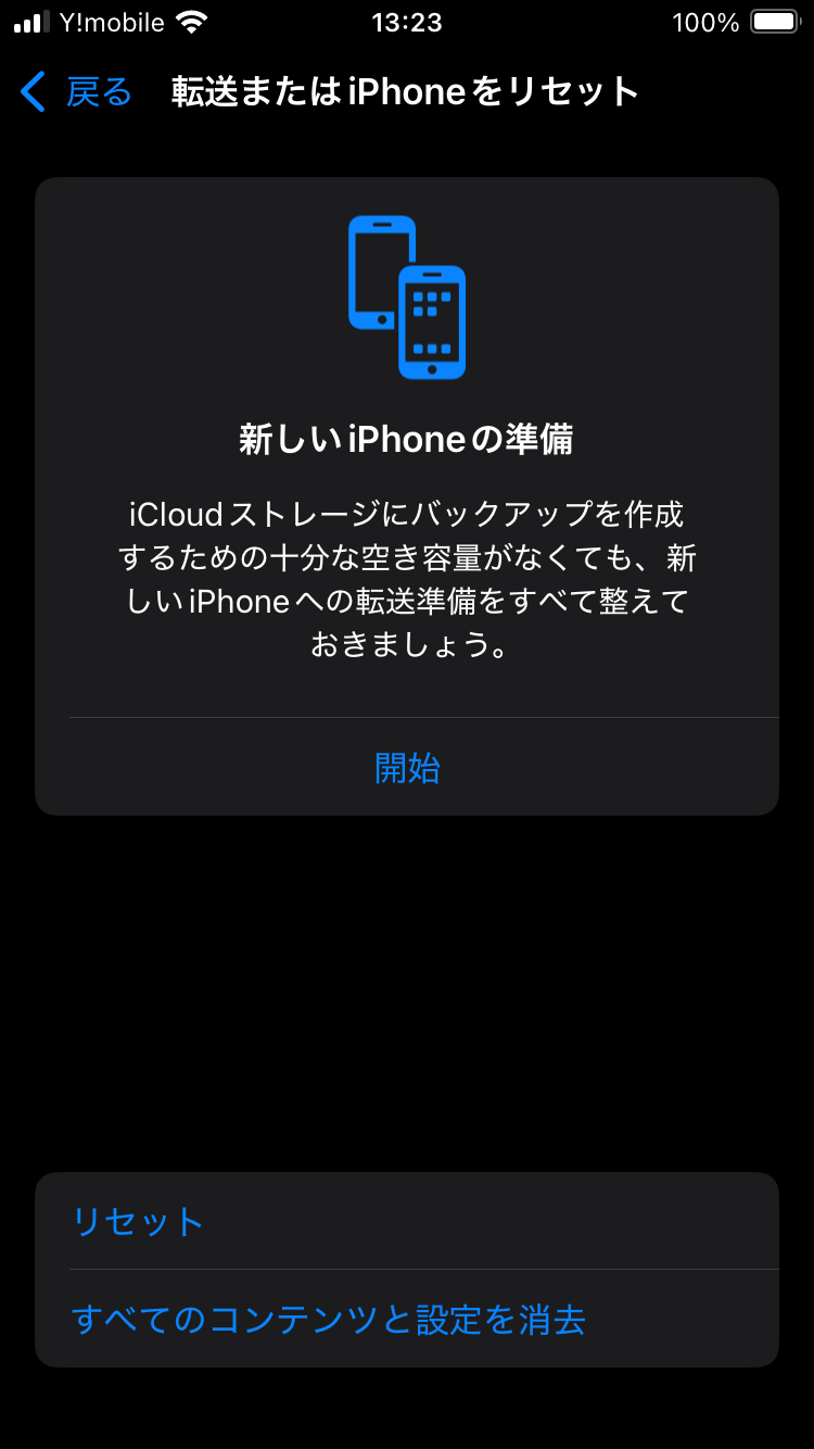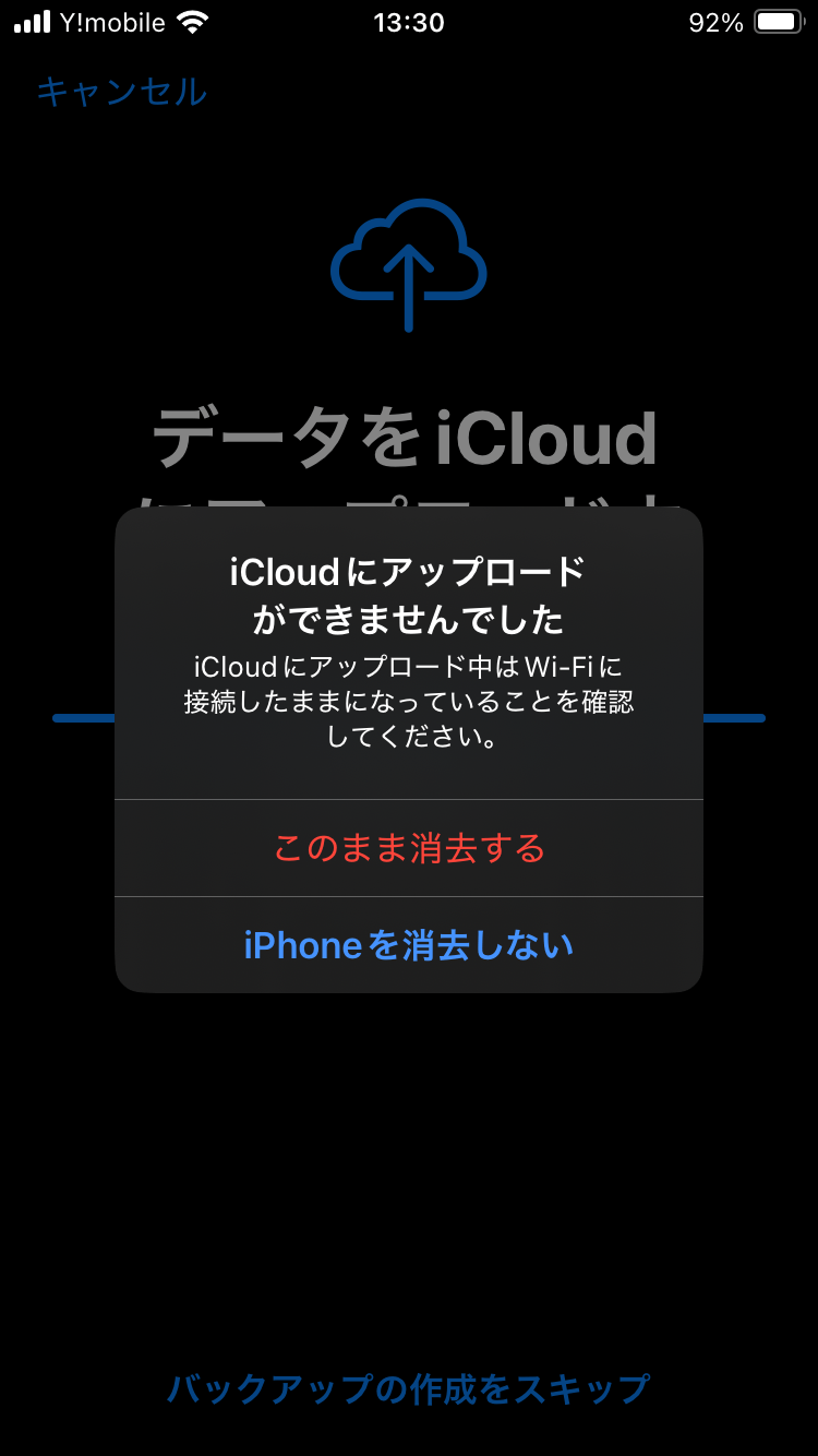 いずれにしても、直前の充電時にiCloudバックアップは取得できていたので、そのまま消去に進みました。