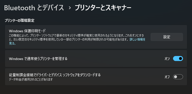 設定 → Bluetoothとデバイス → プリンターとスキャナー → Windows で通常使うプリンターを管理する → オフ