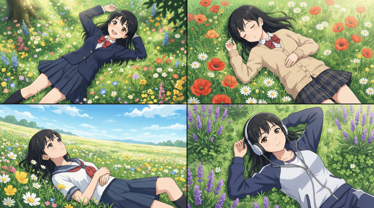 アニメ風のFHDサイズ画像を4パターン生成して。一人の女子高校生。制服。黒髪。茶色い目。昼間。花畑に横になっている姿を上から見た様子。