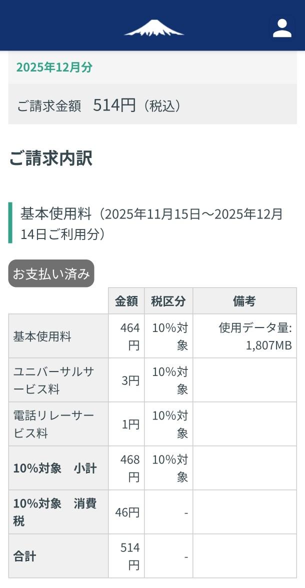 請求額は 514円 になりました。(基本料 294円 + 1GB 220円)