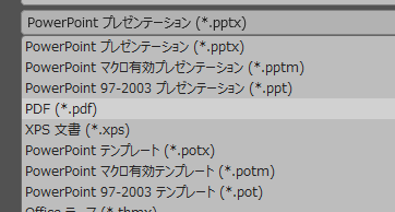 Microsoft Office(今回はPowerPoint)では、「名前を付けて保存」するときにファイル形式を選べる。ここでPDFも選択可能。元のファイルはpptx形式で保存するけど、PDF出力もできるって感じ。これがひとつ目。