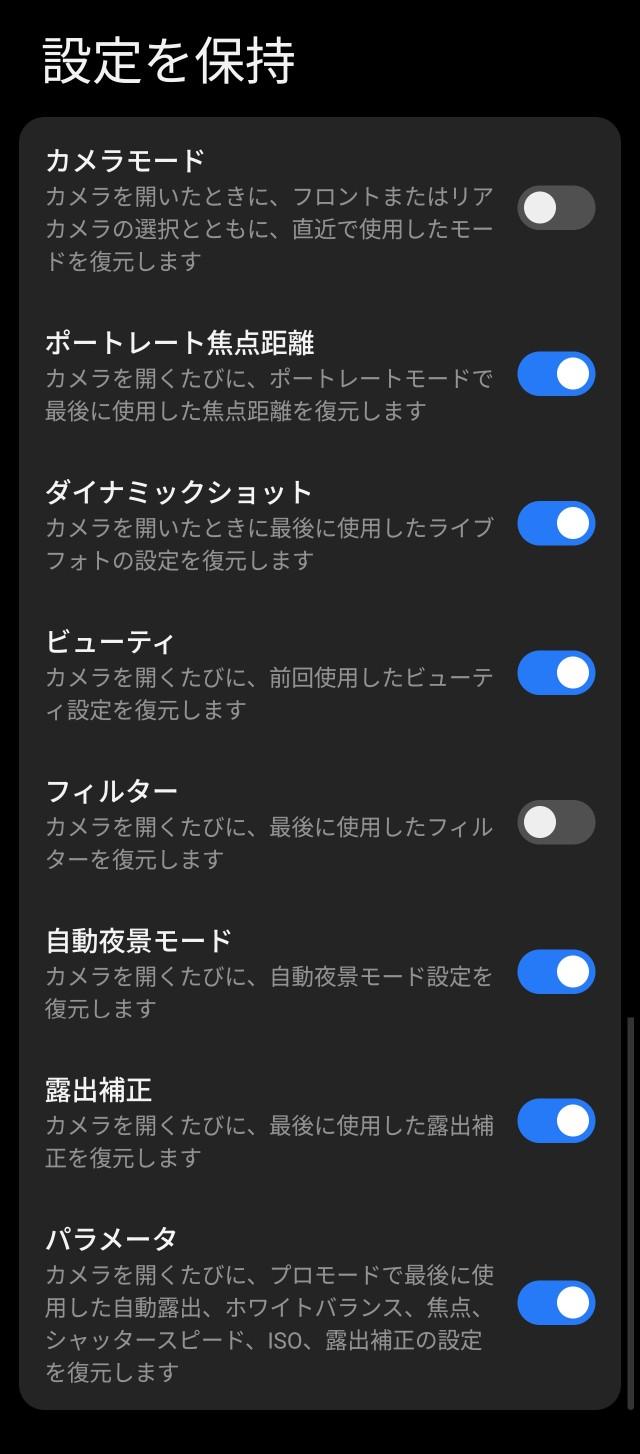 カメラの撮影画面で設定変更した内容は、アプリ起動のたびにデフォルトに戻すか、設定を保持させるか、設定できます。
